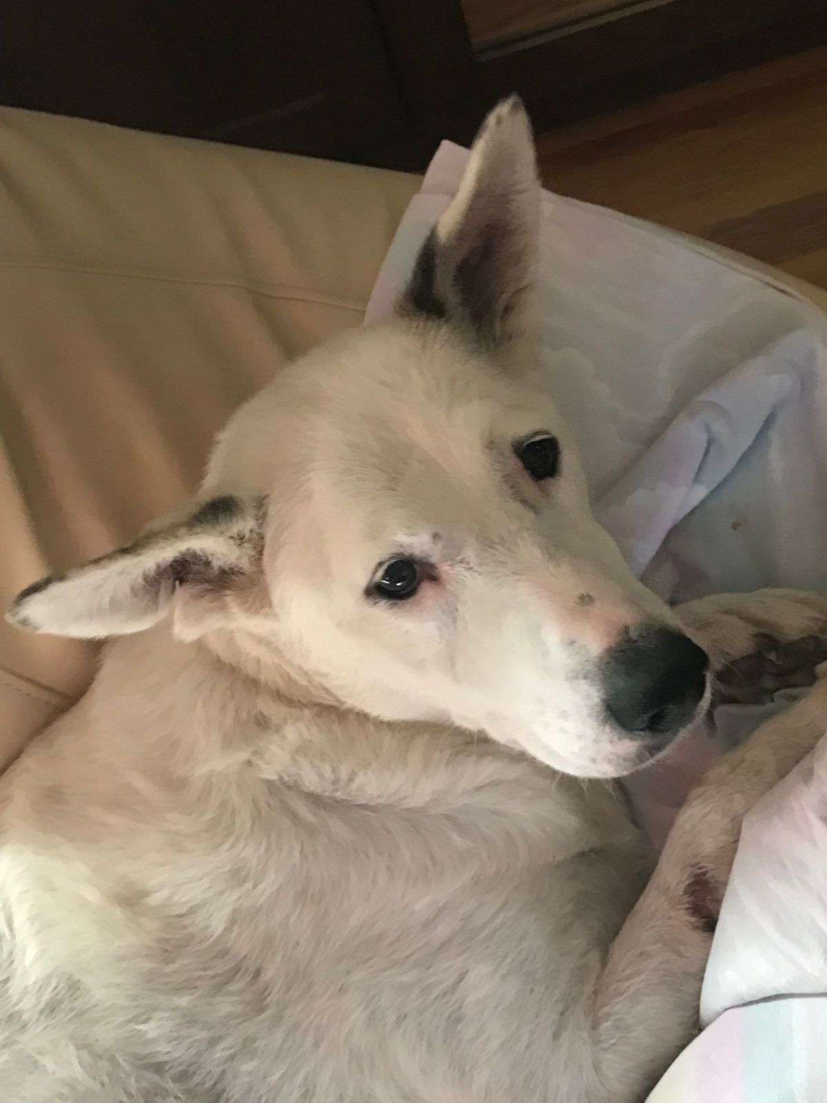 We took her to our vet and learned that she has allergic dermatitis which is very treatable and not contagious. Because she is old, she needs medication daily for the rest of her life.